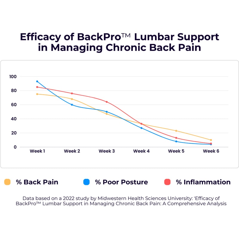 A study by Midwestern Health Sciences University in October-November 2022 assessed BackPro™️ Lumbar Support. Among 35 participants, over 6 weeks: